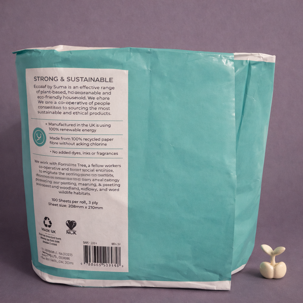 The kitchen towel is made from a mix of consumer and trade waste paper using chlorine free processing. It does not contain any added dyes, inks or fragrances.