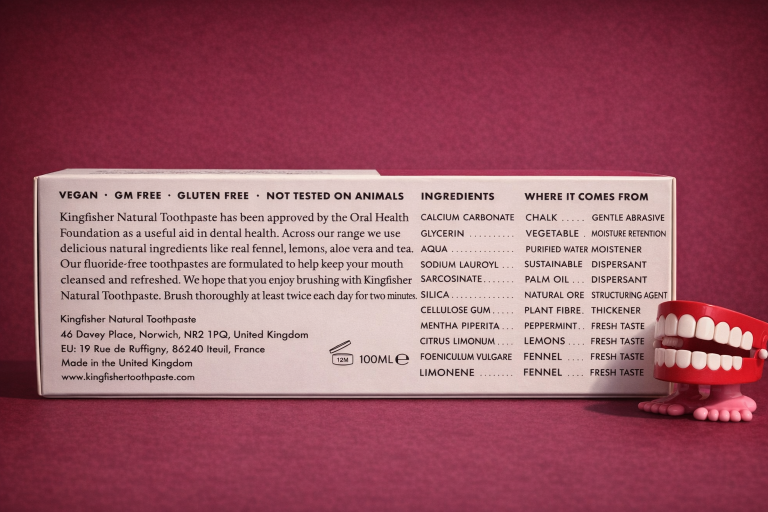 Kingfisher presents a fresh fluoride free, mint natural toothpaste. It contains no artificial sweeteners, flavourings, colourings or preservatives. Gluten and gm free while also being suitable for vegans.